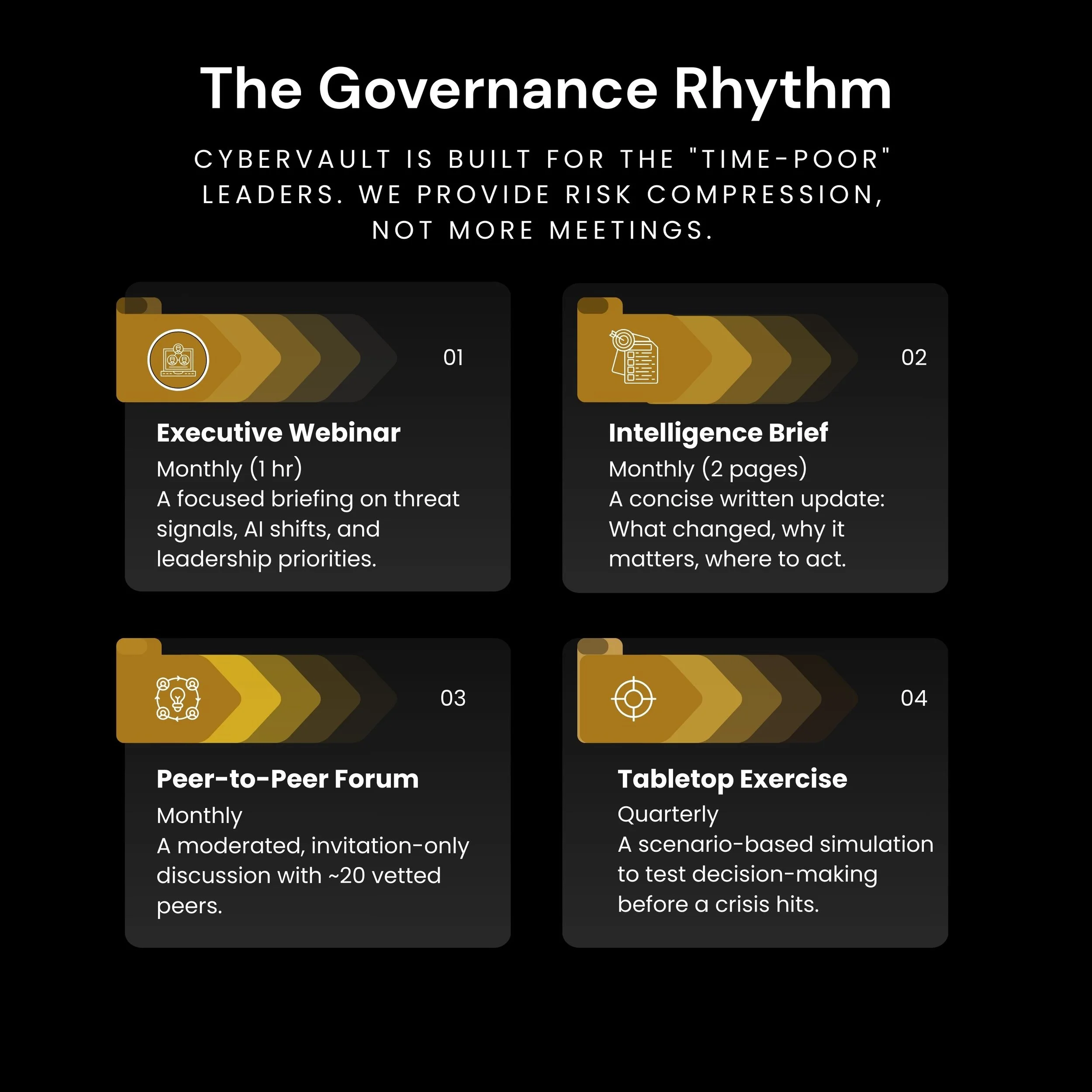 In a world where cyber incidents, governance failures, and data exposure routinely destroy value, CyberVault provides ongoing situational awareness, judgment, and early-warning insight at the most senior level.